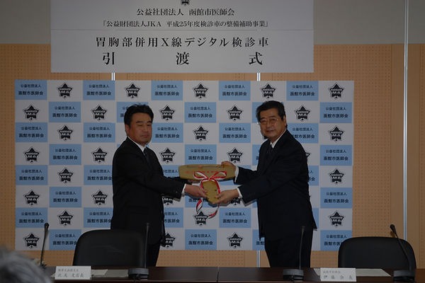 お天気にも恵まれた平成26年2月28日(金)午後1時から、函館市医師会の会議室で、待望の検診車の引渡式が行われ、株式会社常光の北友偉美函館支店長から当会会長へ受渡書と鍵が手渡されました。